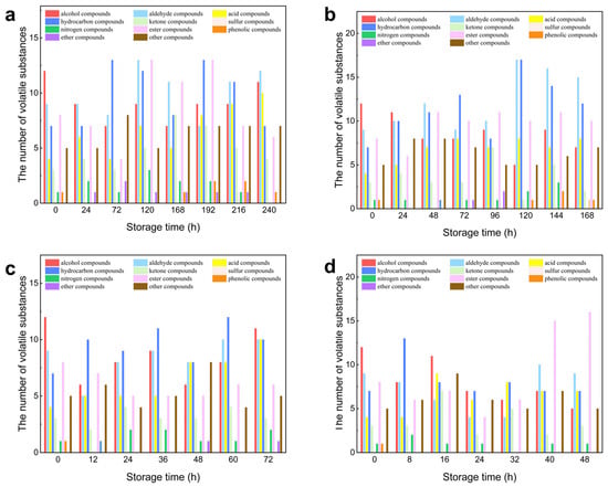 Quantity of various volatile substances in oysters with different storage time levels: (a) 4 °C; (b) 12 °C; (c) 20 °C; (d) 28 °C.