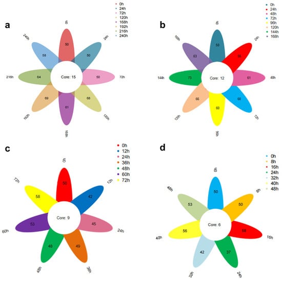 Figure 9c illustrates the Venn diagram depicting the total number of volatile substances in oysters stored at 20 °C over various periods. The figure reveals that seven distinct freshness samples of oysters were identified, containing 50, 42, 45, 49, 48, 53, and 58 types of volatile substances. Notably, these samples shared a common set of nine volatile substances: Ethanol, 2-(dodecyloxy); Eicosen-1-ol, cis-9-; 2,6-Cyclooctadien-1-ol; 2,4-Heptadienal, (E,E)-; Tetradecanoic acid; n-Hexadecanoic acid; 1,5-Cyclooctadiene, 3-(1-methyl-2-propenyl)-; and 3,5-Octadien-2-one. Figure 9d presents the Venn diagram for oysters stored at 28 °C over various periods. From this figure, it can be observed that seven different freshness samples of oysters were identified, with 50, 50, 58, 37, 42, 56, and 53 types of volatile substances. These samples shared a common set of six volatile substances: Eicosen-1-ol, cis-9-; Tetradecanoic acid; n-Hexadecanoic acid; Dodecanoic acid; and cis-2-(2-Pentenyl) furan. The microbial influence during storage leads to fat oxidation and protein hydrolysis, resulting in the loss of older substances and the generation of new ones. Consequently, the number of common volatile substances in oysters with varying freshness levels is relatively small at each temperature.