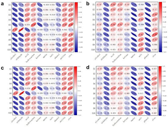 After a comprehensive analysis of the correlation between volatile substances and the sensor array at various temperatures, the results indicated that sensors 1, 2, and 6 exhibited a higher association with amine substances. As shown in Table 1, these three sensors effectively detect nitrogen−containing compounds, demonstrating a high degree of consistency. Furthermore, sensors 1 and 2 displayed a significant correlation with sulfur-containing substances, suggesting that their target gases include sulfides such as hydrogen sulfide. Alcohol substances were found to have a strong correlation with sensors 7, 8, and 9, which consistently detected organic solvents like alcohol. Phenolic substances primarily correlated with sensors 1, 2, and 6, aligning with their high association with nitrogen-containing compounds; this indicates that this type of gas is not confined to a single category but exists in various forms. Aldehyde and ketone substances demonstrated significant correlations with sensor 9, which targets components such as organic solvents, showcasing good adaptability in this context. Hydrocarbon substances primarily involved sensors 1, 5, and 7; these sensors detected target gases including propane, methane, and iso-butane, illustrating strong compatibility in this regard. Additionally, a clear correlation was observed between ester compounds and sensors 6 and 8, while ether compounds were more closely related to channels 3, 5, and 6. Other types of compounds relied more on detection from channels 2, 9, and 10.