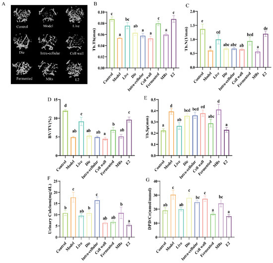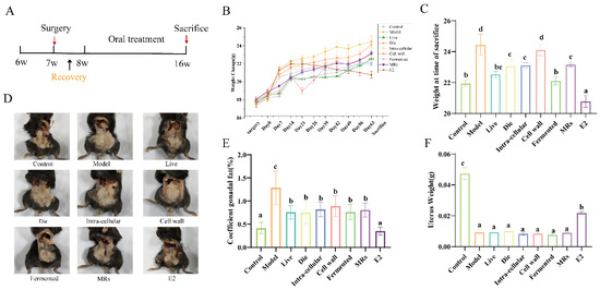 Eight-week-old female C57BL/6 mice were procured from Shanghai Jiesijie Laboratory Animal Co., Ltd., Shanghai, China. The mice were maintained under standard conditions, at a temperature of 25 ± 2 °C, a humidity of 50 ± 5%, and a 12-h light/dark cycle. The mice were provided with low-calcium and low-phosphorus food and sterile water. After one week of acclimatization, mice were randomly divided into 9 groups (n = 10): control, model, live, dead, intra-cellular, cell wall, fermentation broth, MRs, and positive control estradiol-treated (E2). The control and model groups received daily gavage with sterile water. The bacterial solution was administered at a concentration of 1 × 109 CFU/mL (10 mL/kg per day) in the AR495 live and dead groups. The positive control group, treated with estradiol (E2), received a daily gavage dose of 10 mg/kg based on body weight for 9 weeks. All experimental treatments were administered via gavage, with specific dosages detailed in Table 1. Mice were weighed weekly, and urine samples were collected after the final gavage. The experimental procedure is illustrated in Figure 1A.