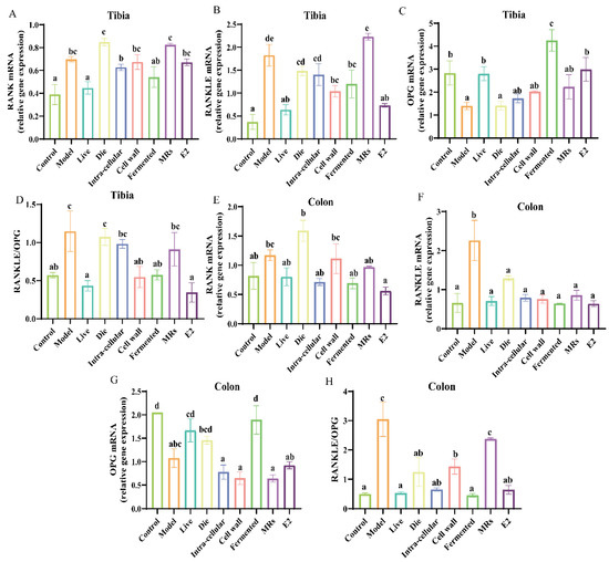 In the colon, our findings indicate that, contrary to inhibiting RANK expression, the group treated with dead bacteria exhibited a significant increase in RANK expression compared to the model group (Figure 3E, p < 0.05). Furthermore, all components of AR495 markedly reduced the expression levels of RANKL relative to the model group (Figure 3F, p < 0.05). The fermentation broth group exhibited a significant upregulation in the expression of OPG (Figure 3G, p < 0.05). Furthermore, the ratio of RANKL to OPG indicated that the live bacterial group, the intracellular material group, and the fermentation solution group were capable of modulating the expression of osteoclast-associated factors, with no statistically significant differences observed compared to the control group (Figure 3F, p > 0.05). However, concerning the regulation of the OPG/RANKL/RANK system, the dead bacteria group, cell wall group, MRs group, and intra-cellular material group demonstrated lower efficacy compared to the live bacteria group and fermentation broth group.