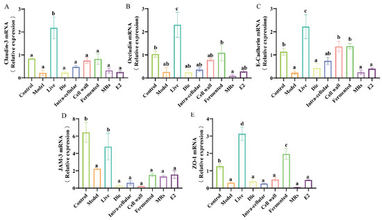 Estrogen deficiency compromises the integrity of the intestinal epithelial structure, allowing harmful substances to infiltrate the body’s internal environment and subsequently triggering an inflammatory response. The live bacterial group effectively increased the gene expression levels of intestinal tight junction proteins (Figure 4A–E, p < 0.05). In addition to JAM-3, the fermentation broth fraction also significantly increased the gene expression levels of Claudin-3, Occludin, E-Cadherin, and ZO-1 (Figure 4A,B,C,E, p < 0.05). The additional treatment groups receiving AR495 exhibited no statistically significant impact on intestinal tight junction proteins (Figure 4A–E, p > 0.05). Furthermore, our findings indicate that while the E2 group significantly ameliorated various osteoporosis-related parameters, it did not enhance intestinal permeability (Figure 4A–E, p > 0.05). This phenomenon may be attributed to specific active compounds present in live bacteria or fermentation solutions, which serve to fortify the intestinal barrier, modulate the intestinal microbiota, and suppress the proliferation of pathogenic bacteria.
