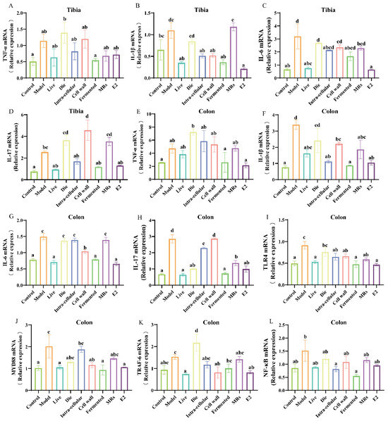 The weakening of the intestinal barrier triggers an immune response and increases the expression of pro-inflammatory factors. Notably, elevated levels of these pro-inflammatory factors are associated with the formation and differentiation of osteoclasts. In the tibia, the presence of live bacteria, intracellular material, and the fermentation broth of AR495 significantly inhibited the gene expression of TNF-α, IL-1β, IL-6, and IL-17 (Figure 5A–D, p < 0.05). Similarly, in the colon, live bacteria and AR495 fermentation broth demonstrated a comparable effect in reducing pro-inflammatory factor levels (Figure 5E–H, p < 0.05). Overall, the live bacteria and fermentation broth groups were able to exert their anti-inflammatory effects more consistently, although other treatments with AR495 may also reduce the expression of certain pro-inflammatory factors. Furthermore, our findings indicate that the fermentation broth group exhibited a superior ability to inhibit the expression of inflammatory factors in the colon.