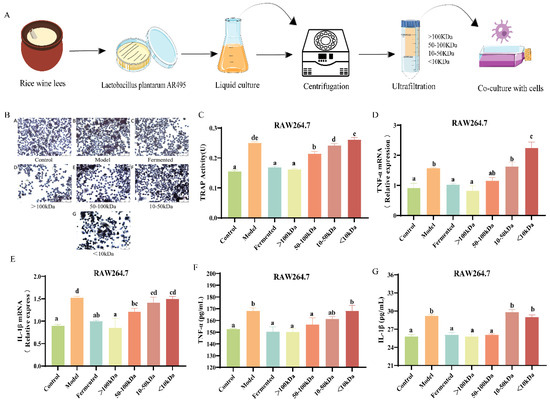 Effects of different molecular weight fractions of AR495 fermentation broth on bone metabolism and inflammation in RAW264.7 cells. (A) Co-culture of different fractions of fermentation broth with cells; (B) Osteoclast morphology observation microscopic findings (×200); (C) TRAP activity after co-culture of RAW264.7 and AR495 with different molecular weight fractions; (D,E) The relative gene expression of the TNF-α and IL-1β; (F,G) The protein expression of the TNF-α and IL-1β. All data are expressed as mean ± SD and analyzed by one-way ANOVA and Duncan’s multiple comparison test, n = 10. Significant differences (p < 0.05) are indicated with different letters (a, b, c, d, and e).