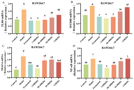 Effect of different molecular weight fractions of AR495 fermentation broth on RAW264.7 pathway proteins. (A–D) The relative gene expression of TLR4, MYD88, TRAF-6, and NF-κB. All data are expressed as mean ± SD and analyzed by one-way ANOVA and Duncan’s multiple comparison test, n = 10. Significant differences (p < 0.05) are indicated with different letters (a, b, c, and d).