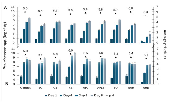 Pseudomonas spp. growth dynamics (counts in log cfu/g ± SD) and average pH values in minced pork (A) and beef (B) in controls and samples supplemented with plant powders, such as blackcurrant (BC), chokeberry (CB), rowan berries (RB), apple, seeds removed (APL), apple with seeds (APLS), tomato (TO), garlic (GAR), and rhubarb (RHB).