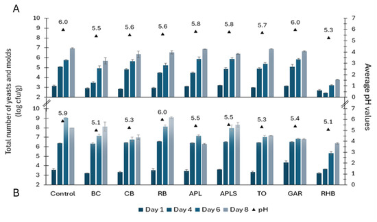 Yeasts and molds growth dynamics (counts in log cfu/g ± SD) and average pH values in minced pork (A) and beef (B) in controls and samples supplemented with plant powders. Abbreviations: blackcurrant (BC), chokeberry (CB), rowan berries (RB), apple, seeds removed (APL), apple with seeds (APLS), tomato (TO), garlic (GAR), and rhubarb (RHB).