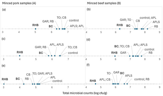 The average total microbial counts (a,b), Pseudomonas spp. (c,d), and yeasts and molds (e,f) arranged in ascending order from left to right in minced pork (A) and beef (B) samples in control samples and samples supplemented with plant powders. Bold font highlights the two most effective supplements based on their effect on total microbial counts. Abbreviations: blackcurrant (BC), chokeberry (CB), rowan berries (RB), apple, seeds removed (APL), apple with seeds (APLS), tomato (TO), garlic (GAR), and rhubarb (RHB).