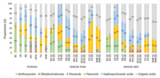 The effect of the other plant powders on the average total count of tested microorganisms was not significantly different from the controls. In addition, the supplemented minced pork and beef samples had quite similar polyphenolic profiles and similar percentage distributions of the polyphenolic compound classes, such as anthocyanins, dihydrochalcones, flavanols, flavonols, hydroxycinnamic acids, and organic acids, on days 1 and 8.