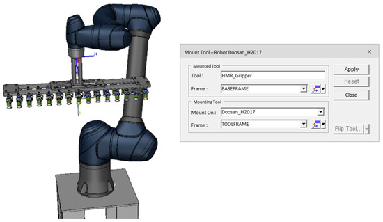 A collaborative robot was selected to improve the process. Commonly known as cobots, collaborative robots are designed to work alongside human operators without posing safety risks [35]. These robots are typically constructed with a lightweight frame and equipped with collision detection control system, making them suitable for shared workspaces. They also operate at a relatively slow speed, prioritizing safety by minimizing risks to human operators and shared workspace objects. An articulated robot with a payload capacity of 20 kg, a reach of 1700 mm, and repeatability of 0.1 mm (Doosan Robotics, Suwon, Republic of Korea, Model: H2017) was utilized. This robot is capable of handling trays with a maximum length of approximately 960 mm and transporting six products at a time, each weighing approximately 3 to 4 kg. The robot model was integrated into the simulation library, which facilitated accurate replication of its movements within the simulated environment. The end-effector used was equipped with 30 vacuum gripping systems designed to load products onto the tray one row at a time. The vacuum pads were supplied by VMECA (Magic Gripper, VMECA Co., Ltd., Incheon, Republic of Korea) and featured Micro 2-stage cartridge dual vacuum cartridges (MC10D) with 2-fold top bellows and an integrated 200-mesh vacuum filter. The technical specifications of the vacuum system include a maximum vacuum pressure of −83 kPa, a maximum suction flow rate of 23 NL/min, and an air consumption rate of 20.3 NL/min at 2.2 bar. This configuration was chosen to ensure secure handling and efficient placement of products during the loading process.