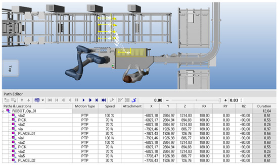 After completing the initial setup, the robot’s process trajectory and speed were configured. Using Tecnomatix Process Simulate software (V16.0.1), the robot’s initial position, known as the ‘Home Position’, was first selected. This is usually set to an appropriate location for starting the task and the same point to which the robot returns after completing its operations. The robot’s movements were planned by identifying pick-up points for the products and placing positions on the tray, connecting these points using point-to-point (PTP) movement. These generated paths were further refined using various features of the software, including collision detection that allowed the robot’s movements to be tested against the actual layout of the production site. The software detected potential collisions with objects such as conveyors, trays, and other equipment, ensuring safe operation.