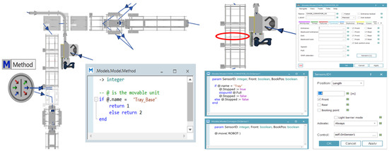 The movement of the robot and the overall system flow were modeled in Tecnomatix Plant Simulation(V2201), as shown in Figure 4. Using the SimTalk programming language in the method function, commands were configured to use conveyor sensors. This configuration ensured that the tray supports continued moving along the conveyor, while trays designated for product loading stopped precisely at the specified position. When the trays reached the robot’s position, the robot performed the assigned tasks according to the process simulation settings. Once the products were fully loaded onto the tray, it was discharged, and a new empty tray was automatically supplied according to the predefined conditions.