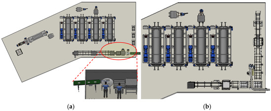 To analyze the utilization rates of workers during production at the existing site, a 3D simulation of the actual work environment was created, as shown in Figure 13. The workers’ movement paths, process execution, and tray transport were modeled in a logic-based system, as illustrated in Figure 14a. The existing equipment was then integrated into the 3D environment to visualize the operation, as depicted in Figure 14b.