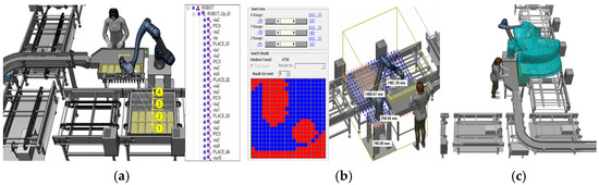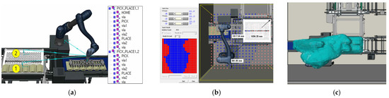 In Case B, a process simulation was created where the robot automatically loads products into pre-determined tray positions. This setup assumes that six products are consistently supplied as part of an order-based production system. The robot’s path was configured, as shown in Figure 13a, with numbers 1 and 2 indicating the sequential steps of the robot’s movement. Given the limited workspace and the need for fully automated product loading without workers, the robot’s speed was intentionally set slowly. The suitability of the robot’s placement was analyzed, as depicted in Figure 13b, confirming that it was positioned in the optimal blue area, while the red areas indicate unsuitable positions. The simulation also investigated potential collisions and interferences between the robot, the walls, and the automated system components. Figure 13c illustrates that no collisions occurred during the 19 iterations of the process.