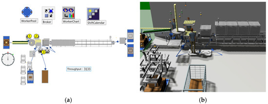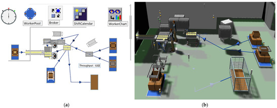 Figure 14. Analyzing throughput and utilization rate using plant simulation in Case B: (a) Logic of the manual process, (b) 3D simulation of the manual process.
