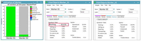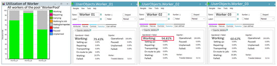 The simulation included the manual process, where a worker produces approximately 648 units per hour, to analyze the worker’s utilization rate. The utilization rate of the worker responsible for loading products onto trays was analyzed to be 99.47%, as shown in Figure 15. The high utilization rate shows that the worker is overburdened and constantly performing tasks without any breaks. This emphasizes the urgent need for improvements, such as introducing a robotic automation system. In contrast, the worker responsible for retrieving the cart with empty trays, waiting, supplying trays, and transporting the loaded cart had a utilization rate of just 6.11%. In the actual site, complex tasks and movement paths often lead to confusion. To address this, the simulation simplified these elements by separately defining work activities for analysis. This approach implies an inherent imbalance in the workers’ tasks.