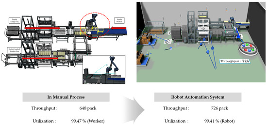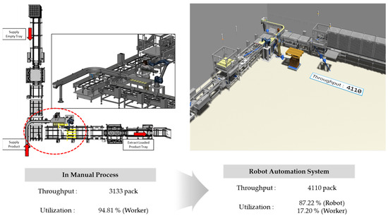 The results of the overall simulation model with the applied robot are shown in Figure 9. When empty trays are supplied, the automated tray separation system delivers them one by one to the robot’s position. Once the empty trays reach the process, both the worker and the robot carry out their respective tasks. Based on the process speed derived from the simulation, it was analyzed that approximately 4110 products could be processed within the same time frame.