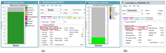 For both the existing process and the robotic automation system, the Plant Simulation program was configured with common settings, including Availability and the Shift calendar. Availability was set at 95%, representing the percentage of time the equipment was capable of performing the assigned tasks. In the food industry, maintaining high reliability was considered crucial due to the need for very low probabilities of operational issues. The mean time to repair (MTTR) for the robot was set at 15 min, which was defined as the minimum time required to restore the equipment to its initial operating state after a shutdown. The Shift calendar was configured based on a 5-day, 40 h workweek, meaning that the simulation results reflected the performance of the process during an 8 h maximum daily operation.