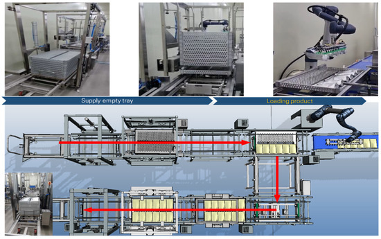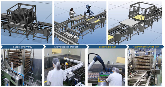 To validate the results of the robotic automation system derived from the simulation, it was implemented in the actual site as shown in Figure 18. The process began when the worker supplied the trolley loaded with empty trays, and production started simultaneously as the products were produced. The system was designed so that once six products were automatically aligned and supplied, the robot would start its operation. The robot-initiated movement after receiving confirmation signals that both the products and empty trays had arrived. In practice, the empty trays were supplied and fully loaded with products, and the robot automation system achieved a throughput of approximately 723 units per hour.