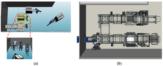 Figure 12. Simulation model of case B: (a) Existing site of the food manufacturing process, (b) Application of robot automation system.