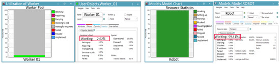 The objective of both cases was to enhance the production process in order to increase throughput per hour or, at the very least, maintain productivity through the implementation of a robot-automated system. Improvement could be achieved in several ways, with the current bottlenecks and product imbalance representing the main obstacles to overcome. To evaluate the impact of the enhanced simulation on these factors, a series of key performance indicators (KPIs) were selected for analysis. Only production-related KPIs were used for evaluation. The selected KPIs were throughput, utilization rate, and human resources. The modeling and logical sequence were developed using the standard library tools of Tecnomatix Plant Simulation from Siemens (V2201). Each of these basic KPIs reflected performance aspects derived from simulation based on monitored and measured data from the actual site. The KPIs could be grouped into similar categories to reduce complexity [36].