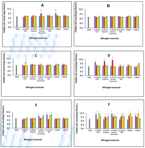 Effects of different combinations of carbon and nitrogen sources on viable cell number of six Lactiplantibacillus plantarum strains. (A) RG11; (B) RG14; (C) RI11; (D) RS5; (E) TL1; and (F) UL4 strains. MRS medium was used as a control medium. The values for viable cell number are the mean ± standard deviation (SD), n = 3. The asterisk indicates a significant difference (p < 0.05).