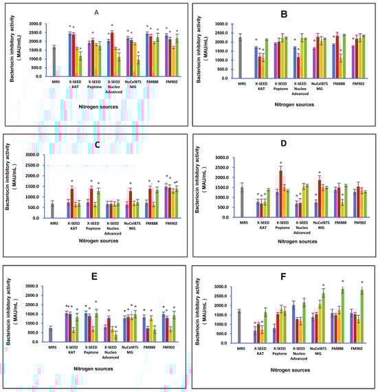 Effects of different combinations of carbon and nitrogen sources on the bacteriocin inhibitory activity of six Lactiplantibacillus plantarum strains. (A) RG11; (B) RG14; (C) RI11; (D) RS5; (E) TL1; and (F) UL4 strains. MRS medium was used as a control medium. The values for bacteriocin-inhibitory activity are the mean ± standard deviation (SD), n = 3. The asterisk indicates a significant difference (p < 0.05).