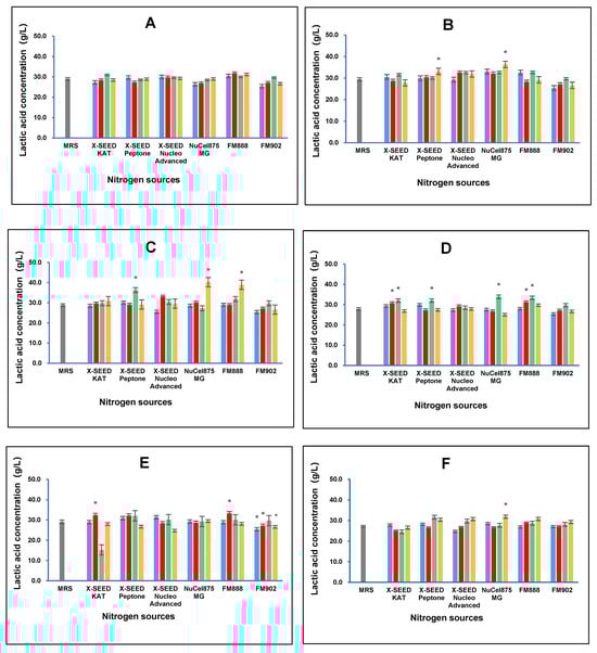 Effects of different combinations of carbon and nitrogen sources on the lactic acid concentration produced by six Lactiplantibacillus plantarum strains. (A) RG11; (B) RG14; (C) RI11; (D) RS5; (E) TL1; and (F) UL4 strains. MRS medium was used as a control medium. The results of lactic acid concentrations are the mean ± standard deviation (SD), n = 3. The asterisk indicates a significant difference (p < 0.05).