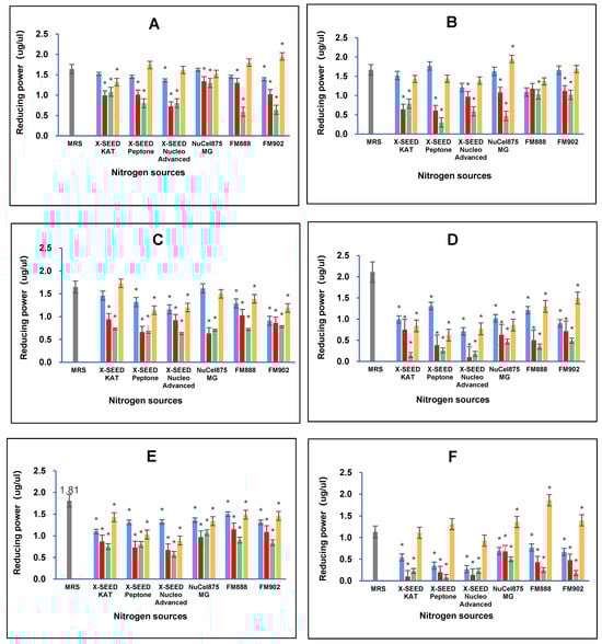 Effects of different combinations of carbon and nitrogen sources on the reducing power of postbiotic metabolites produced by the six Lactiplantibacillus plantarum strains. (A) RG11; (B) RG14; (C) RI11; (D) RS5; (E) TL1; and (F) UL4 strains. MRS medium was used as a control medium. The values of reducing power are the mean ± standard deviation (SD), n = 3. The asterisk indicates a significant difference (p < 0.05).