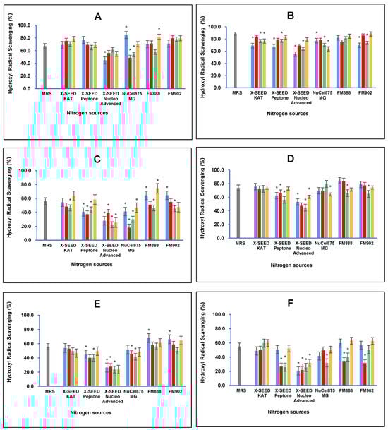 Effects of different combinations of carbon and nitrogen sources on the hydroxyl radical scavenging activity of postbiotic metabolites produced by the six Lactiplantibacillus plantarum strains (A) RG11; (B) RG14; (C) RI11; (D) RS5; (E) TL1; and (F) UL4 strains. MRS medium was used as a control medium. The hydroxyl radical scavenging activity values are the mean ± standard deviation (SD), n = 3. The asterisk indicates a significant difference (p < 0.05).
