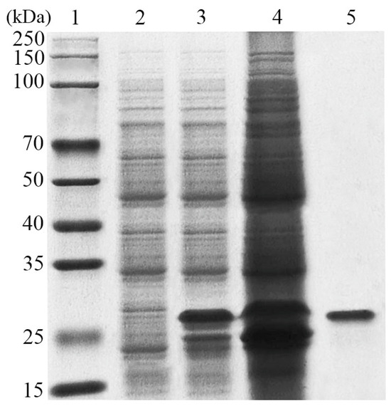 The coding sequence of the chitosanase without the signal peptide was successfully expressed in E. coli BL21 cells containing the recombinant plasmid pET29a-LeCHO1. The recombinant protein with a 6×His-tag, purified using a Ni-NTA affinity column, exhibited a single band on SDS-PAGE corresponding to a molecular weight of approximately 27-kDa (Figure 2), consistent with its calculated molecular mass of 27.3 kDa.
