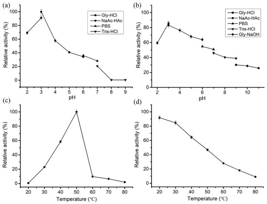 Biochemical characterization of purified LeCho1. (a) Optimal pH of LeCho1. (b) pH stability of LeCho1. (c) Optimal temperature of LeCho1. (d) Thermal stability of LeCho1. The data represent the average of independent assays carried out in triplicate. The error bars indicate the standard deviations.