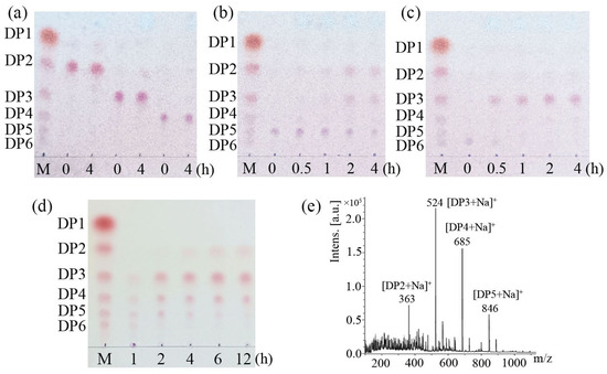 In addition, hydrolysates of chitosan after 12 h of enzymolysis were analyzed using matrix-assisted laser desorption ionization-time-of-flight mass spectrometry (MALDI-TOF MS) [30] on a Bruker Autoflex time-of-flight mass spectrometer (Bruker Daltonics, Karlsruhe, Germany). During detection, 2,5-dihydroxybenzamide (DHB) (20 mg/mL DHB dissolved in 30% acetonitrile with 0.1% trifluoroacetic acid) served as the matrix to assist the ionization of hydrolysates. The acceleration voltage was set to 29 kV in reflection mode. All spectra were obtained in positive ion mode. The target mass range was an m/z ratio of 100/2000.