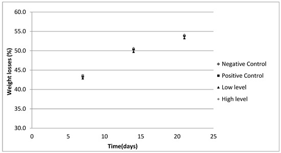 Once the sausages were formed, they were dried in the industrial dryer of our pilot plant at temperatures between 12 °C and 14 °C and 85% RH for 21 days. The weight losses at the end of the maturation process were between 43.3–54.1% (Figure 1). Seven sausages per batch were prepared, although 5 per batch were analyzed. Therefore, a total of 20 sausages were evaluated. At the end of the maturation, each sausage reached a weight of around 190 g.