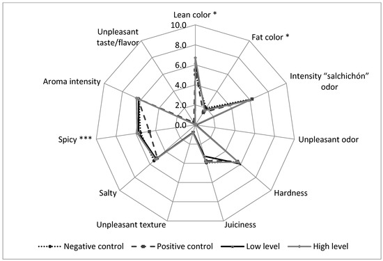 For sensory evaluation, a trained sensory panel was formed by eight judges with specific training in the sensory analysis of dry-cured products. Two slices from each dry-cured sausage were presented to each panelist. At each session, one dry-cured sausage from each batch was analyzed, so a total of five sessions were required. The following descriptors were examined: lean color (uncured–cured) and fat color (white–yellow), intensity “salchichón” odor, unpleasant odor, hardness, juiciness, unpleasant texture, salty, spicy, aromatic intensity, and unpleasant taste/flavor. The intensity of each parameter was calculated from 0 = low intensity to 10 points = high intensity. Panelists assessed the different parameters by a quantitative–descriptive analysis with a structured scale (0–10). Data were collected using the FIZZ software, 2.45 A version (sensory analysis and computer test management) (Biosystemes, Couternon, France). All sessions were conducted at room temperature in a sensory room equipped with white, fluorescent lighting. About 100 mL of water at room temperature were provided to the panelists between samples.