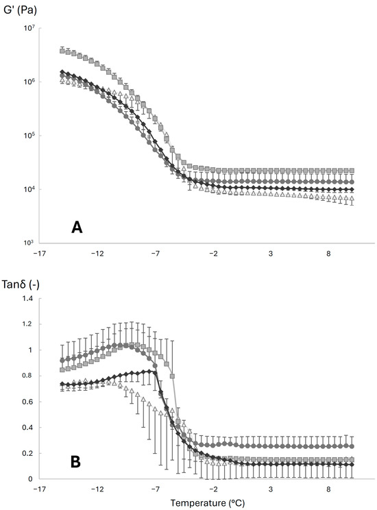 Evolution of storage modulus (G′) (panel A) and tan δ (panel B) of ice cream samples subjected to the temperature ramp test (from −15 °C to 10 °C, strain 0.05%, frequency 10 Hz) (n = 3). S1 (triangles): ice cream produced with sweet buttermilk, without the addition of emulsifier/stabilizer; S2 (squares): produced with sweet buttermilk, with the addition of emulsifier/stabilizer; S3 (circles): produced with sweet buttermilk UF to 3 degrees of concentration; S4 (diamonds): produced with ultrafiltered buttermilk to 5 degrees of concentration.