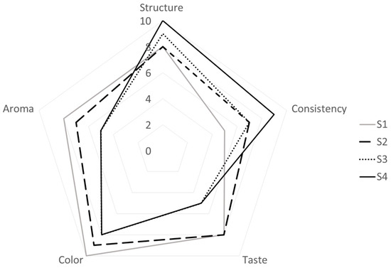The sensory acceptability analysis was performed according to [27] by 15 untrained panelists. The considered sensory indexes, evaluated on hedonic scales, were the following: taste—10 points, structure—10 points, consistency—10, color—10 points, and aroma—10 points (maximum overall score—50 points).