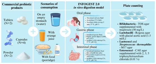 We purchased eight probiotic products from a local pharmacy and stored them according to the conditions specified on the labels until analysis (Figure 1). To simulate in vitro GI digestion, we used three different media: sterile purified water, commercially available 100% orange juice (pasteurised), and a meal. For the meal, we mixed 5 g of commercially available finely minced porridge (containing 25% dried fruit) with 15 mL of UHT whole milk (3.5% milk fat) and pasteurised it by heating it above 75 °C for 5 min. We performed viable counts of the labelled bacterial species or groups both before and after the simulated digestion. The tests were performed in triplicates.