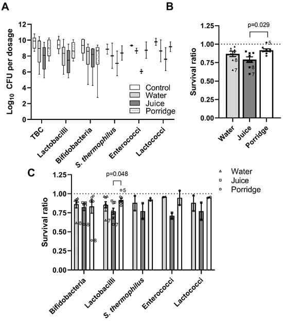 Products #7 and #8 deviated from the others with a lower survival rate, especially in water and juice. We observed similar trends when we checked the survival rate of each genus (Figure 2C)—the survival rates of bifidobacteria from sample #8 and lactobacilli from sample #7 were considerably lower compared to the other samples. For example, only 2.7 log10 CFU of bifidobacteria survived the test in the samples with porridge and 5.2 log10 CFU of lactobacilli from sample #7 survived the test in the samples with juice (Table 2). As the labels of these two products did not contain any specific instructions for use (Table 1), the likelihood of consumers receiving an inadequate dose of live probiotic strains is even greater.