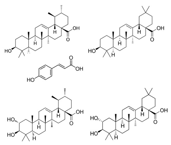 Structures of ursolic acid (UA, upper left), oleanolic acid (OA, upper right), p-hydroxycinnamic acid (middle), corosolic acid (CA, lower left), and maslinic acid (MA, lower right).