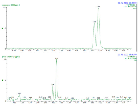 UPLC-MS extracted ion chromatograms. (top): cranberry presscake, monitored at [M-H]− = m/z 455.4; peaks eluting at 5.62 and 5.88 min, monitored at [M-H]− = m/z 455.4, were identified as oleanolic acid (OA) and ursolic acid (UA), respectively. (bottom): cranberry presscake, monitored at [M-H]− = m/z 471; peaks eluting at 2.96 and 3.19 min were identified as maslinic acid (MA) and corosolic acid (CA), respectively. Mass spectra can be found in the Figures S1–S4.