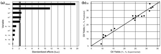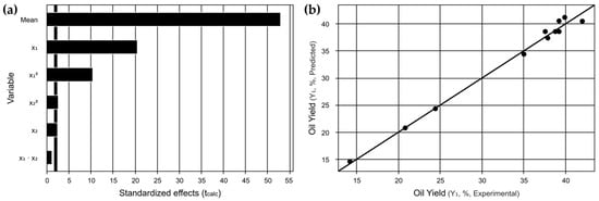 Based on Figure 3a, the Pareto chart validates the significance of the linear and quadratic factors of x1 and x2, which fall within the predetermined significance level (<0.1). The linear x1 and quadratic factors corresponding to the solid–liquid ratio holds the most significance and demonstrate the importance of solid–liquid ratio in determining the optimal region for microwave-assisted oil extraction from Moringa oleifera Lam seeds. One possible explanation for this is related to mass transfer, as the greater amount of solvent facilitates this process. Meanwhile, the graph in Figure 3b illustrates a notable correlation between the predicted and actual experimental results. Additionally, the achieved coefficient of determination displays a high level of confidence with an R2 value of 99.08%.