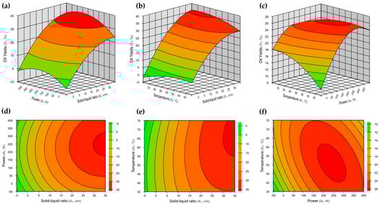 Response surface graphs (a–c) and contour curves (d–f) for oil yield. (a,d) Solid–liquid ratio and power; (b,e) solid–liquid ratio and temperature; (c,f) temperature and power.