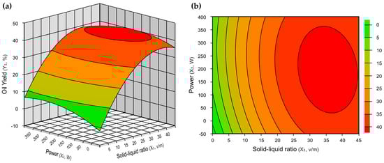 Response surface graphs (a) and contour curves (b), in relation to the effect of solid–liquid ratio (x1) and power (x2) on oil yield. Optimal microwave extraction conditions for Moringa oleifera oil are highlighted in red ellipse.