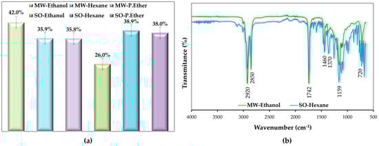 FTIR analyzed the functional groups present in Moringa oleifera oil. The oil obtained by microwave-assisted extraction with ethanol (MW–Ethanol) was compared with the more conventional method, Soxhlet with hexane (SO–Hexane), as shown in Figure 5b.