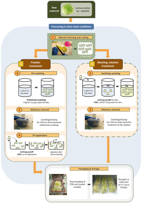 Flowchart of FC lettuce processing under ultraclean conditions (8 °C), using the proposed sanitizing treatments: enriched vinegar in powder form (A) or as a washing solution (B). VP = vinegar powder; VW = vinegar washing; CTRL = control treatment. Arrows indicate the addition of VP.