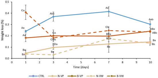 Weight loss of control (CTRL) and treated fresh-cut lettuce during cold storage at 4 °C for up to 10 days (mean (n = 3) ± standard deviation). CTRL, control (absence of encapsulated vinegar); N-VP, normal (acidic) enriched vinegar powder; B-VP, buffered enriched vinegar powder; N-VW, normal (acidic) enriched vinegar powder washing solution; B-VW, buffered enriched vinegar powder washing solution. Different uppercase letters denote significant differences (p < 0.05) among different treatments for the same storage time. Different lowercase letters denote significant differences (p < 0.05) among different storage times for the same treatment.