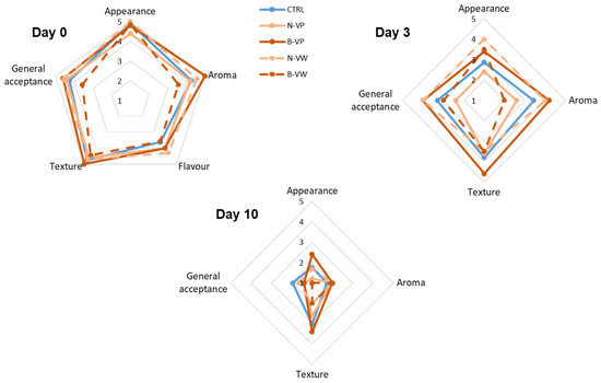 As the storage time progressed (day 3), a deterioration in the sensory quality of samples was observed, especially in terms of appearance (Figure 4). The N-VP and buffered vinegar treatments also showed a deterioration in their visual quality, which is usual in FC vegetables [9]. On the other hand, the N-VW treatment maintained a considerably good appearance (4.0 points), controlling the appearance of oxidations leading to the absence of browning and high acceptance of samples. Despite the visual detriment during storage, samples were still considered acceptable (3.0–4.0 points), except for the N-VP treatment (2.4 points). It could be due to the release of the encapsulated acetic acid together with the bioactive compounds, which led to the appearance of reddish and more yellowish shades (+a* and +b*) concerning the processing day; this visual deterioration impaired their acceptability [13].