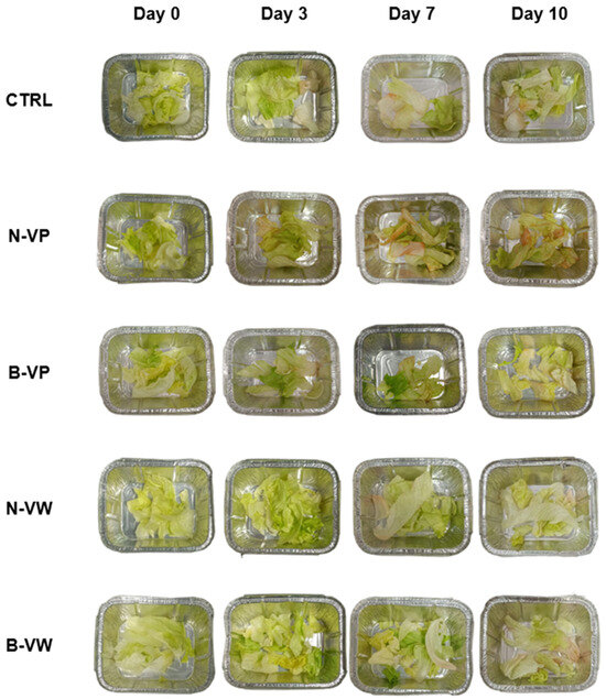 Fresh-cut lettuce evolution during cold storage at 4 °C for up to 10 days. CTRL, control (absence of encapsulated vinegar); N-VP, normal (acidic) enriched vinegar powder; B-VP, buffered enriched vinegar powder; N-VW, normal (acidic) enriched vinegar powder washing solution; B-VW, buffered enriched vinegar powder washing solution.