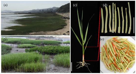 Views of smooth cord grass (S. alterniflora) in the coastal areas of Fujian. Smooth cord grass in Lianjiang county, Fuzhou, in early April 2022 (a) and in Quanzhou city in May 2022 (b); (c), seedling of S. alterniflora sampled from Xiapu county, Ningde; (d) tender and edible stems of S. alterniflora harvested from Xiapu; (e) the S. alterniflora cuisine served in local restaurants in Xiapu county. The scales in (c,d) are presented for 5 cm and 1 cm length, respectively.